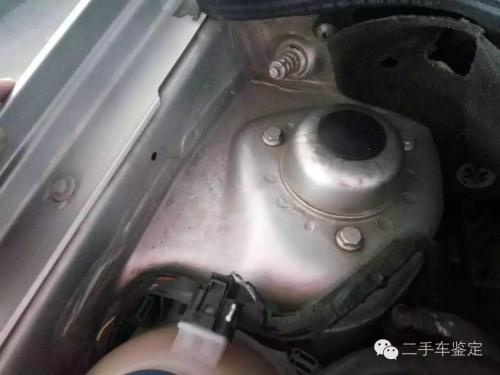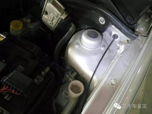 左前翼子板更换,车辆铭牌缺失,总总的迹象把矛头对准了左前减震器支架,它一定有问题,我们重点检测左前减震器支架: