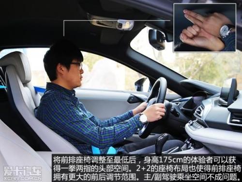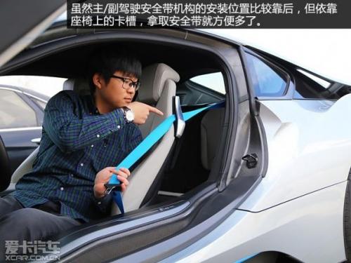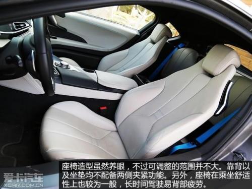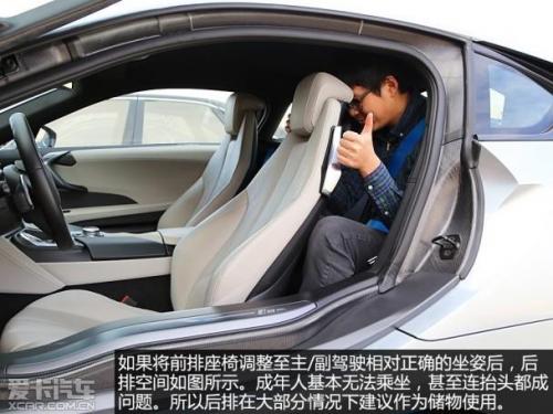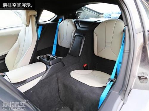 打开车门后你会发现,这台i8采用了2 2的座椅布局。那么这是否意味着它在乘坐方面具有一定的实用性了?很遗憾的告诉您,恐怕没有一个成年人愿意长时间的坐在这辆i8的两个后座上。大部分情况下,后排空间充其量只能作为储物使用,也一定程度上增加了前排座椅的调整范围。