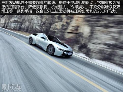 当你对于车辆固有的观念被一次一次刷新的时候,那种被震撼同时又享受其中的快感实在美妙。卸下伪善面具的i8是如此狂妄,每每当你深踩下油门踏板,都是一次让身体以及耳朵穷奢极恀的体验。1.5T三缸发动机并没有用高转速去压榨马力,所以你当然不用像驾驶F1赛车那样转速过万才换挡。由于有了电动机的帮助,宝马也就不需要考虑这台1.5T三缸发动机需要在低转速区间有何等的输出能力。