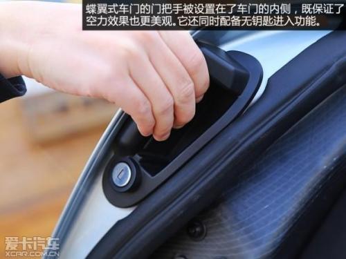 这辆宝马i8有着出色的空力设计,不过在外部配置方面其实并没有我们想的那样高大上。首先来看看这个宝马引以为傲的激光大灯,虽然有着先进的技术以及足够的噱头……不好意思,回到现实中来,这辆i8其实只配备了LED大灯,而且它也并没有配备弯道辅助以及随动转向功能。炫酷的蝶翼式车门将把手隐藏在车门后方,并配有无钥匙进入功能。
