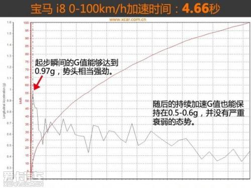i8的百公里加速成绩最终定格在4.66秒。如果按照同价位的超跑来对比的话,i8的测试成绩只能算中等水平,并没有太过抢眼的表现。不过对于一辆用1.5T三缸发动机加电动机作为动力储备的车来说,i8算得上后生可畏。