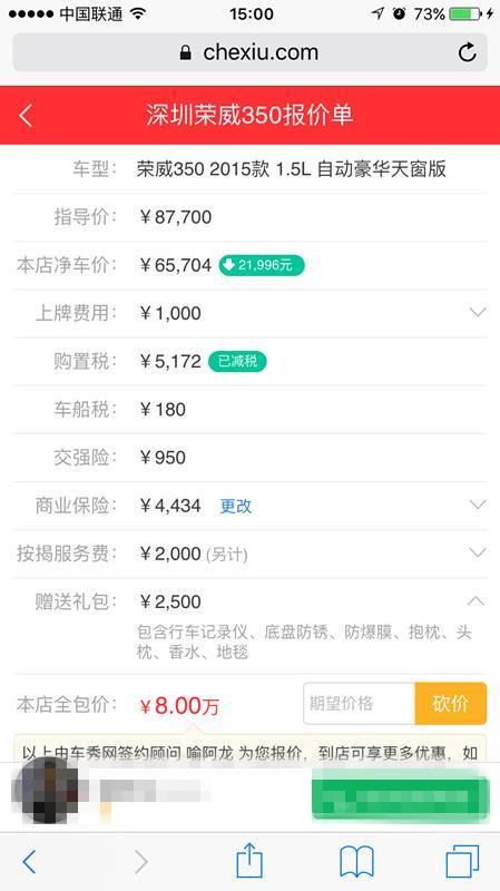 价格分析:荣威350的这款车型在深圳的裸车价是6.43万,厂家指导的价格是8.77万,优惠2.2万,在深圳最高8万可以落地。