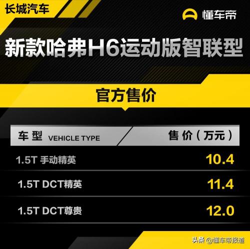 [懂车帝原创产品]日前,长城汽车官方宣布,新款哈弗H6运动版智联型正式上市,新车提供搭载1.5T发动机的三款车型可选,售价区间为10.4-12万元。