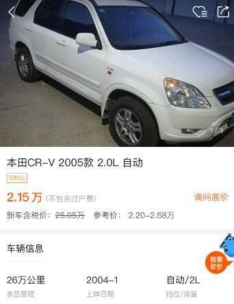 黑龙江的一个车友最近入手了一辆二手的本田CRV,他买的这台车是2004年上牌的,仅用了2.15万元就买了下来。我在网上查了一下同年限的市场价,在2.20万元到2.58万元之间,看来黑龙江车友的这台车要比市场价还低一些。