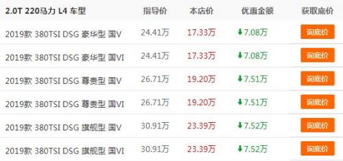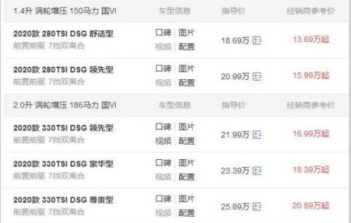 新款迈腾是在去年12月就完成了更新,它在带来更强大的产品力之外,优惠幅度也是很有诱惑力的,以2020款280TSI DSG舒适型为例,它的指导价为18.69万元,在部分地区的最低报价为13.69万起,优惠了5万元。
