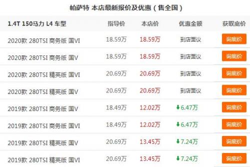 我们再来看一下帕萨特,2019款帕萨特在市场中也是有7万左右的优惠(部分地区),但是2020款是在今年4月份才推出,所以在优惠上暂时还没有做出松动,这一点上,显然是2020款迈腾有更多的优势。