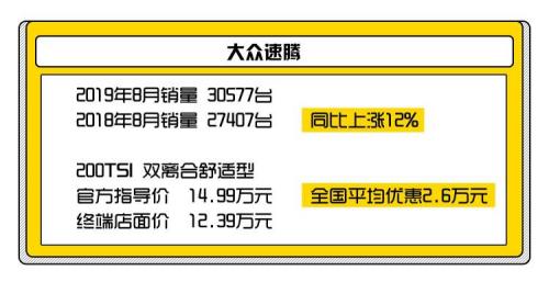 尽管速腾刚刚上市只有半年的时间,但目前全国平均优惠已经高达2.6万元,如今众多价格低廉的紧凑级轿车,给速腾带来了较大的销售压力。一直高高在上的速腾,也不得不放低姿态。以速腾200TSI双离合舒适型为例,全国平均优惠2.6万元,终端优惠后提车价为12.39万元,这个价格可以说相当亲民了。
