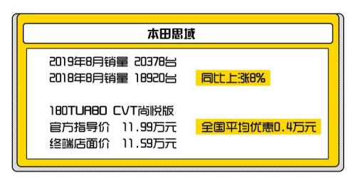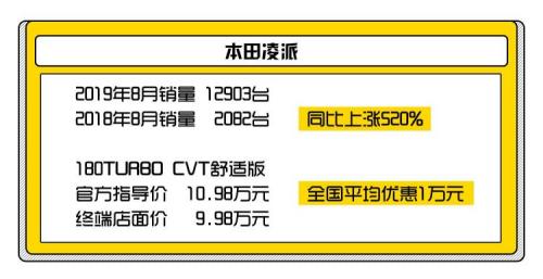 2019年8月份,本田凌派销量1.29万台,同比上涨520%,看上去销量暴涨。不过翻看历史数据,我们发现恰好2018年8月是一个销量最低点,此前的销量维持在接近万台左右。不过不得不说,2019年的成绩确实要比2018年好,2019年月销量基本上全部都在万台以上。