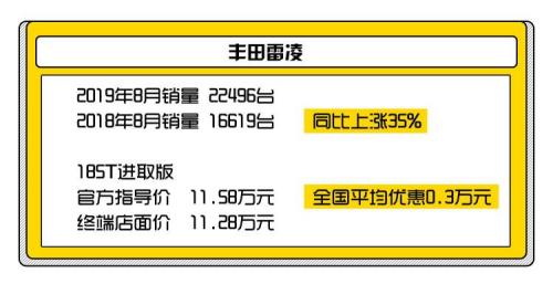 丰田雷凌2019年8月销量2.25万台,同比增长35%,这是雷凌为数不多的销量破2万台大关,而在此前,雷凌的月销量普遍维持在万台初头。因此雷凌在2019年8月份,跻身轿车销量排行榜第6名,进步明显。