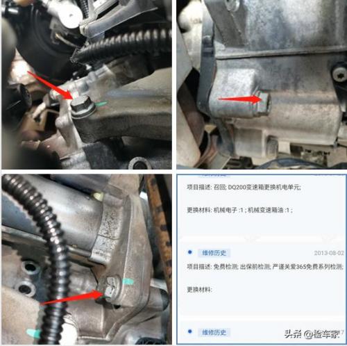 注意看,这个位置一下让小杨猝不及防,刚还在夸奖车主,现在却......大家可以通过图片清晰的看到变速箱机脚垫固定螺丝存在拆卸痕迹,还有就是变速箱与发动机之间的螺丝也有拆卸痕迹,看来变速箱有问题可查啊,而且变速箱的附件和线束都有拆卸的痕迹,应该是维修变速箱或者是更换总成。但是此车前端无事故,那会是什么原因造成维修呢?为了查清楚造成这个情况的原因,我查了一下车辆的维保记录,结果显示车辆的变速箱总成有过召回更换。