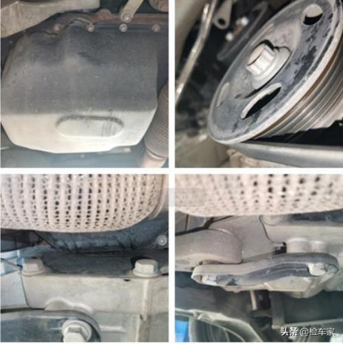 发动机油底壳无渗油,但底部有轻微剐蹭,不过不影响使用,曲轴螺丝没有拧动的痕迹,变速箱下支架有过拆卸,这是更换变速箱需要拆卸的,属于正常拆卸。