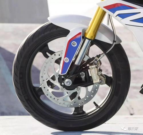 G310r使用41mm倒立式前叉,并且前叉不可调。前轮煞车碟盘使用BYBRE 300mm固定式碟盘
