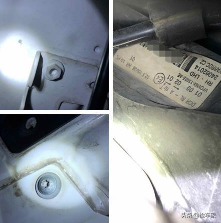 机盖螺丝表面光滑漆面平顺自然,无任何拧动拆卸痕迹,这也印证了外观检测机盖无喷漆及拆卸更换,两侧叶子板固定螺丝也无任何拧动拆卸痕迹,螺丝无移位,一般情况下,叶子板及周边位置没有事故磕碰的情况下,螺丝是不会动的,两前大灯生产日期为2014年6月份,与车辆生产日期相匹配,为原厂大灯。