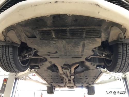 经过一段简单的路试后,跟卖家一起来到店里上架,对底盘进行检测,初步观察底盘外观没有发现明显的损坏和修复痕迹,底盘没有明显漏油迹象,整体来说比较中规中矩,车身底盘是否存在问题接下来进一步查看。