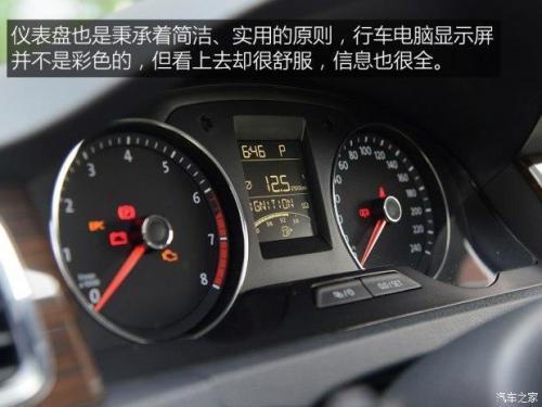 三辐式方向盘的握感真不错,皮革手感细腻,缝线也比较讲究。多功能按键都在顺手的位置。定速巡航按键集成在转向拨杆上,很快就能够熟悉使用。仪表盘也是秉承着简洁、实用的原则,行车电脑显示屏并不是彩色的,但看上去却很舒服,信息也很全。
