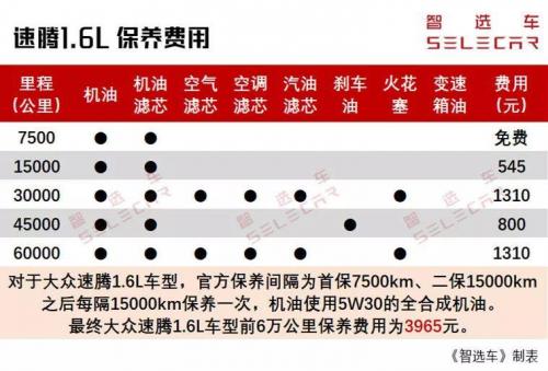 凭借着第二次之后15000km的保养间隔,速腾1.6L车型前6万公里仅需保养5次即可,其中首保还是免费的。前6万公里总计3965元的保养费用比较亲民,不过到第8万公里时需要更换6速手自一体变速箱油,这将是一笔不小的支出。