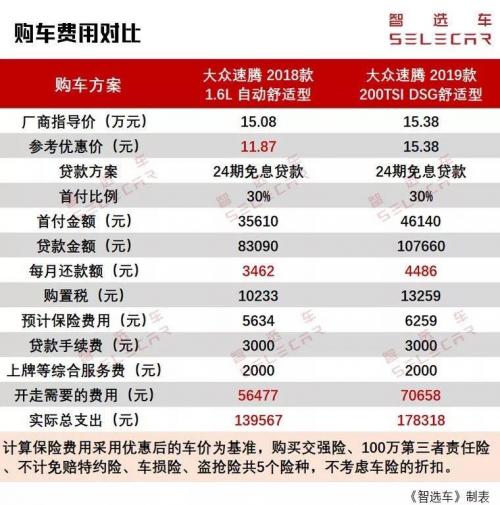 针对大众速腾这款车型,小智了解到4S店可以提供首付30%、24期免息贷款,贷款手续费为3000元。最终,开走2018款1.6L自动舒适型和2019款200TSI DSG自动舒适型分别需要56477和70658元,实际总支出相差了接近4万元。