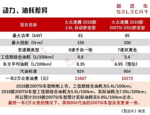 从上表中可以看出,2018款速腾1.6L自动舒适型和2019款全新速腾200TSI DSG舒适型的用车成本非常接近,一年2万公里仅仅相差百元。