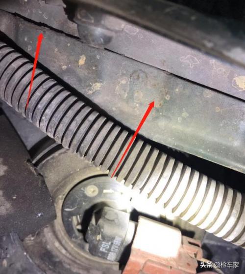事故车辨认有非常多的方法,也需要查看很多的部位,但最终的目的只有一个,那就是勘查出这辆车曾经是否发生过严重交通事故,严重到什么程度。通过检测大梁、左右翼子板支架、内衬并没有发现存在大面积修复之类的迹象,因为这辆陆巡为非承载式车身,车架较厚所以一般的小撞击很难导致大梁变形,所以我就将重点放在了前部的水箱框架上。