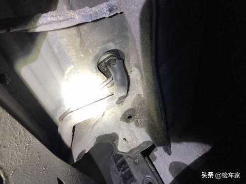 需要伸头弯腰观察水箱框架后方的情况,平时的检测过程中发现很多车在水箱框架最里侧的边缘更容易发展钣金变形,图中存在大面积锈蚀的地方就是之前的一个撞击点,好在力度不大,修复面积也很小,对这种非承载式车身的车来说并没有什么影响。