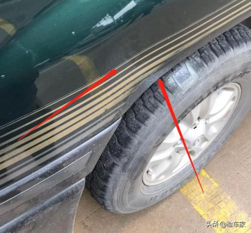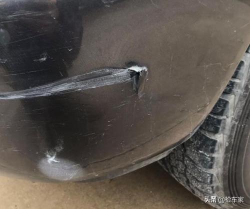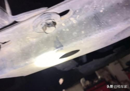 对了,前后保险杠也有二次喷漆的痕迹,同时侧面有一个大面积的剐蹭伤痕,这也是最常见的是擦伤。因为保险杠具有很强的韧性,直接撞击也很难产生孔洞,即使是脱离的部分,一般都还会粘连在保险杠上,所以修复起来也非常方便,100块就能搞定,最多再加个喷漆。