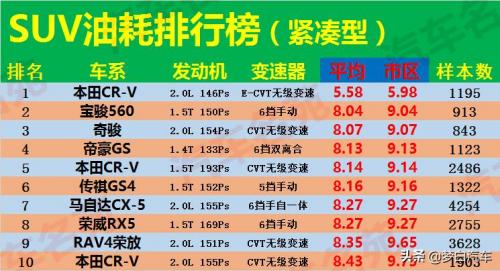 导读:随着国内消费压力的不断增大,大家对于汽车的经济性也是更加重视,所以在选购汽车时,都非常在意它们的油耗。而我们都知道,SUV车型的油耗普遍偏高,很多车主在不了解真实油耗的情况下,就草率的提车了,后来才发现自己被“忽悠”乐,所以我们在买车时一定要谨慎一些。而为了给大家一个油耗参考,本期内容要和分享的是油耗网站近期更新的SUV油耗最新排行榜,希望它能够给我们消费者带来一些帮助。最新!SUV油耗最新排名出炉,CR-V榜首,奇骏前5,博越力压哈弗H6!