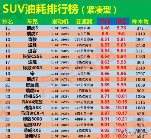 其次,SUV(紧凑型)油耗排名前三十位的车型,国产车奇瑞瑞虎5和奇瑞瑞虎7的手动挡车型比较不错,平均油耗都在8.5L左右,而长安CS55排名第16位,比亚迪宋排名第19位,传祺GS4自动挡排名第23位,吉利远景SUV排名第28位,性价比较高的哈弗M6排名第30位。合资车方面,日产逍客排名第15位,大众途观排名第17位,三菱欧蓝德排名第20位,马自达CX-4排名第26位。