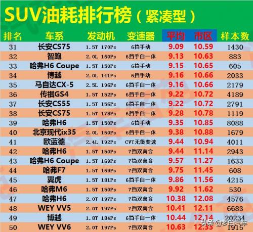 最后,SUV(紧凑型)油耗排名前五十位的车型,国产车长安CS75排名第31位,平均油耗在9.1L左右,哈弗H6Coupe版排名第33位,吉利博越2.0L排名第34位,哈弗H6手动挡排名第39位,平均油耗在9.3L左右,哈弗H6自动挡排名第42位,哈弗F7排名第44位。而合资车方面,智跑排名第32位,马自达CX-5排名第35位,现代ix35排名第40位,三菱欧蓝德排名第41位,福特翼虎排名第45位。