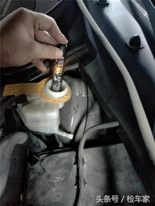 刹车油有轻微的变质现象,刹车油马虎不得,对车辆制动安全性有着直接影响。经油笔测试刹车油水分含量已经亮黄灯了,建议及时更换。建议各位老司机也要对自己的爱车进行定期检查养护。