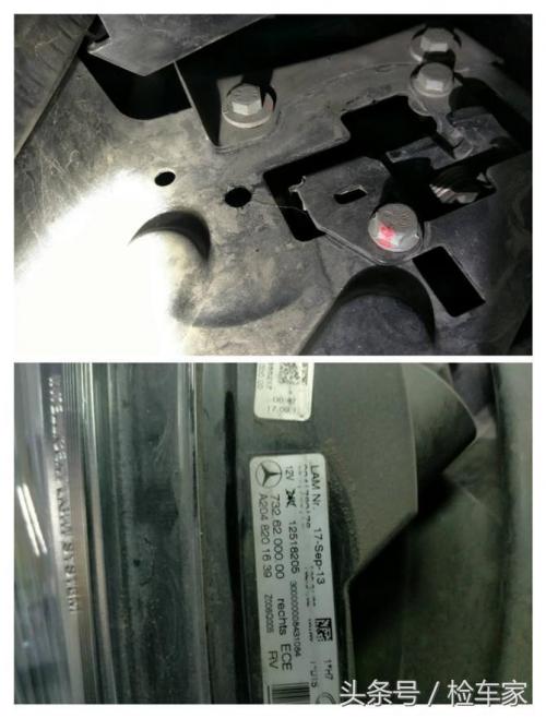 注意看上图,图一为大灯螺丝和机盖锁的固定螺丝,经检测,螺丝都不存在拆卸拧动的痕迹。,图二中明显可见大灯生产日期为17日9月13年,由此可确定大灯也是原车大灯。