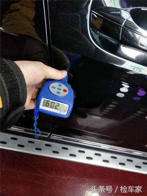 依次对左前门漆面进行检测,通过对左前门的漆面检测也没有发现异常。为什么说主要对左前门的下部进行检测?因为小编之前检测车辆,发现一些车主神经比较大条,开门也不看,经常造成不必要的磕碰。各位老司机多多注意吧,现在喷漆这么贵,而且这种豪车即使去修理厂也是看车下菜的。