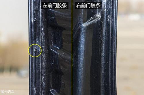 第一眼看车辆右侧时就感觉不对劲,对比两侧车门我发现,右前门的胶条虽然均匀,但是没有左前门的胶点,这种胶点是原厂车间里机器人打胶时留下的,证明右前门也是后期更换的。