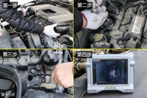 取下发动机护板,拔下火花塞线束再拆下火花塞,将内窥镜的探头伸入对应的气缸中,就能从显示屏上看到气缸内的积碳情况。