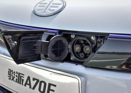 首先说一下外观,延续了骏派A70的风格,但是在一些细节处进行了调整,比如进气格栅采用了纯电动车最为常见的封闭式造型、下方设计有充电接口,此外,前保险杠加入蓝色装饰条,彰显我是一台新能源车。车身尺寸为4610/1790/1500mm,轴距为2652mm。