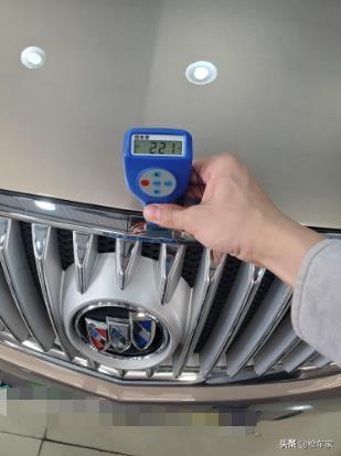 接下来拿出专业设备检测漆面数值,发现机盖做过喷漆处理,但是数值并不是很高,此时推测车辆前部可能遭受过比较轻微的撞击。