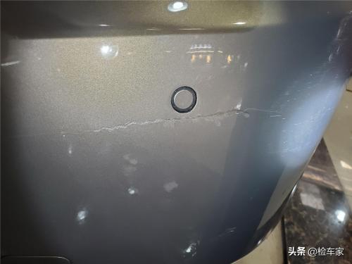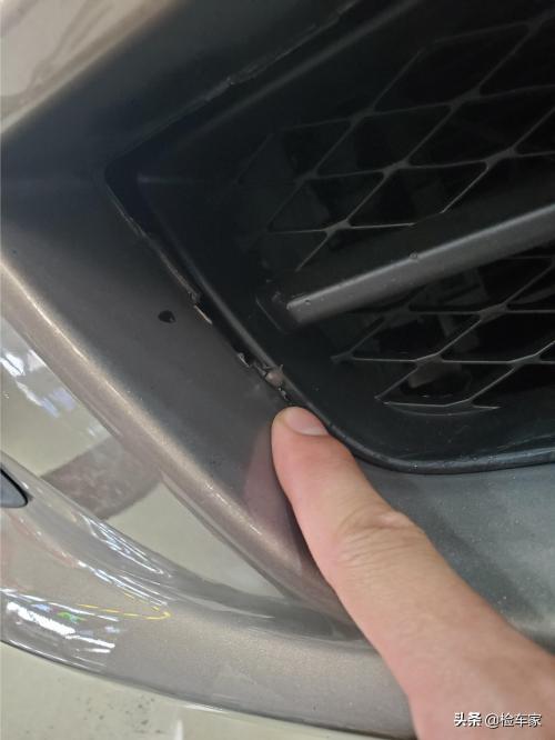 开始检测,绕车一圈发现前杠与下中网缝隙大,没有安装好,通过前杠边缘毛刺可以看出来前杠是更换过的。