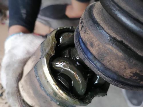 这辆11年的老奇骏是胖哥前年帮客户代售的,现任车主也行驶了5万多公里,保养维修一直在胖哥这里。前两天在换机油保养时,胖哥发现左半轴内球笼防尘套老化开裂,球笼里面的油全都甩了出来。所幸的是车辆起步、转弯、上坡没有任何异响表现。初步判断是刚漏不久,灰尘砂石还没有进入球笼里面,现在及时更换还来得及。否则,就要更换内球笼总成。