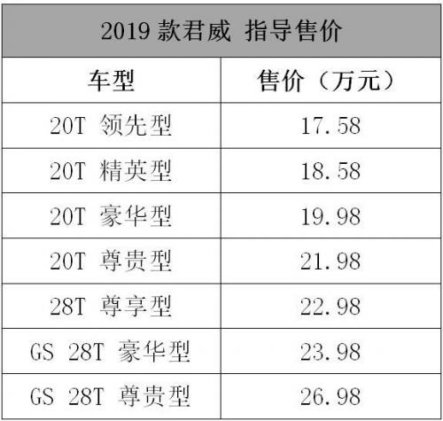 2019款君威正式上市,售价区间为17.58-26.98万元,推出包括普通版本和君威GS在内的7款车型。2019款车型的变化?不好意思,几乎没有!
