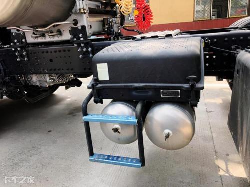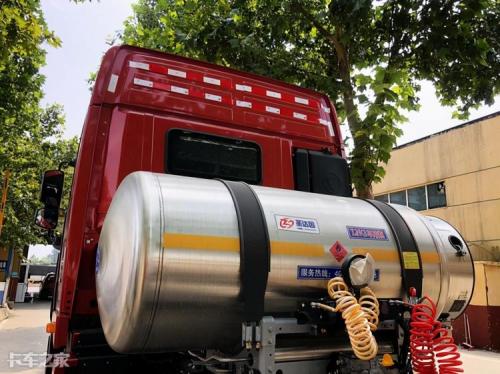 容积995L的LNG气罐安置在驾驶室后方位置,整体续航能力接近1000km,相比较1350L超大容量储气罐适合中长途物流运输,降低整备质量。