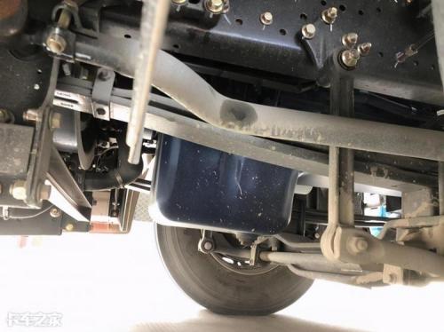 前桥采用两片簧抛物线钢板悬挂,并且带有立式油压减震筒、前置横向稳定杆提升综合路况下的通行能力。