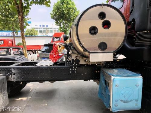 通过照片不难发现,这款LNG动力车型底盘骨架尾部标配导静电橡胶拖地带,这一配置源于GB7258政策中明确的具体内容:加气量大于或等于375L的气体燃料车辆,应安装导静电橡胶拖地带,拖地带导体截面积应大于等于100平方毫米,且拖地带接地端无论空、满载应始终接地。