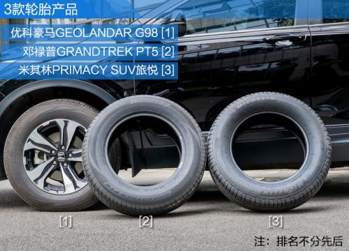 本次测试的三条轮胎分别为邓禄普GRANDTREK PT5(以下简称:邓禄普PT5)、米其林PRIMACY SUV旅悦(以下简称:米其林旅悦)和优科豪马GEOLANDAR G98(以下简称:优科豪马G98)。注:目前邓禄普PT5还没有正式上市。