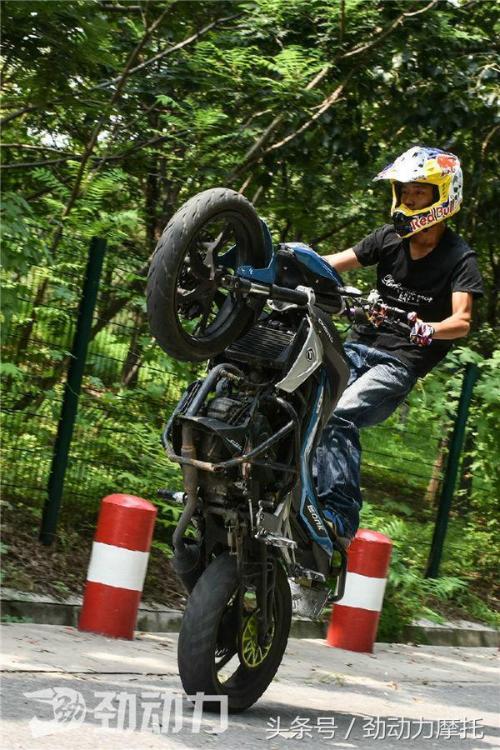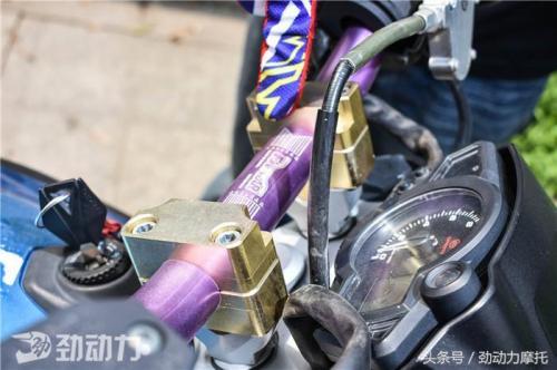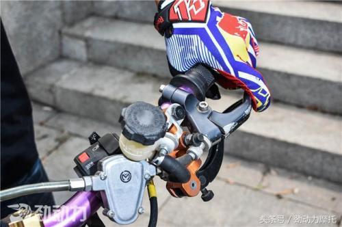 为了适应特技动作的需要,他更换了加高车把压码和高强度铝合金变径车把。