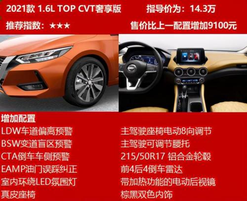奢享版指导价为14.3万,比智享版车型贵了9100元。作为顶配车型,奢享版的配置也是最高的,不仅增加了LDW、BSW、CTA、EAMP这几项辅助驾驶的功能,还配备了主驾驶电动座椅、前4后4倒车雷达、真皮座椅等这些配置。而顶配车型换装的215/50R17的五幅切削轮毂,由于胎壁比较薄,所以使得车身高度也降低了3mm,最小离地间隙降低了4mm。不过,这也使得低配车型看起来更加的运动,整体的视觉效果也更好。可以说,奢享版车型整体的安全系数、乘坐舒适度、外观颜值都是非常高的,达到了这个级别车型的主流标准。不过,就是售价有些高了,在这个售价基础上再多加些钱也就可以买到更高一级别的天籁了。