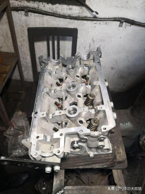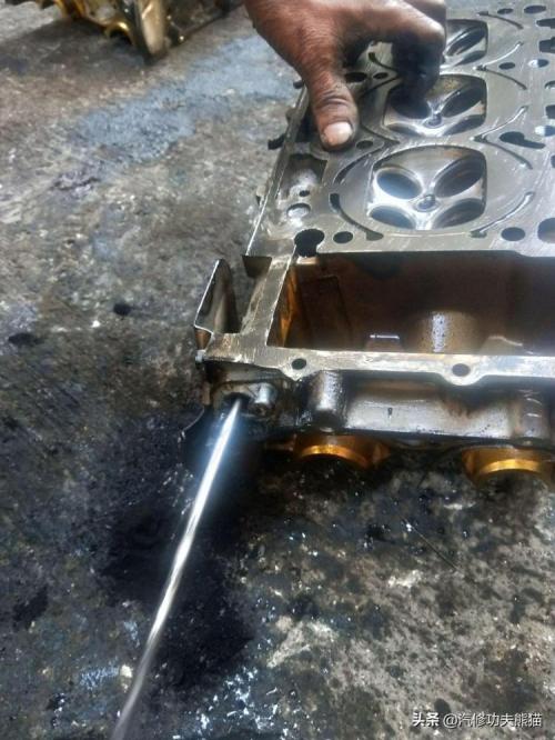 然后是缸盖,也冲洗干净,同时从二次进气的孔喷水进去,另外三个小孔的地方,有水柱出来,说明里面通了