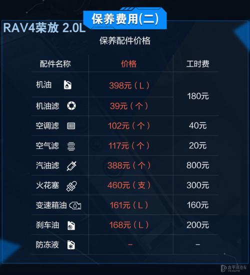 而从配件价格表中我们可以看到,奇骏的工时费相比RAV4荣放会更便宜。重要的是,在汽油滤和变速箱油上有绝对优势,没有具体的配件价格和工时费,能为车主节省掉部分费用。