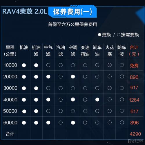 同样按三年六万公里的计算,RAV4荣放4290元的总花费相比奇骏的5543元要便宜,这是因为RAV4荣放1万公里一保的保养间隙上存在优势。