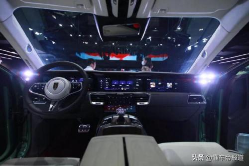 红旗E-HS9车内科技感十足,将搭载新一代红旗智联系统,车内配备三面一体式环绕大屏、一面中控屏、两面后排座椅屏和后排中央扶手大屏,组成了七屏娱乐系统(IVI3.0)。前排座椅后方同样提供多媒体屏幕供后排乘客。换挡区域还配备了水晶电子挡把,整体内饰豪华、科技氛围十分浓厚。