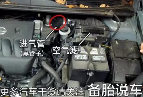 我们首先打开发动机舱,然后你找找看,有一个黑色盒子,旁边连着一根进气管,就是一个有螺纹的大粗管子。