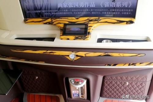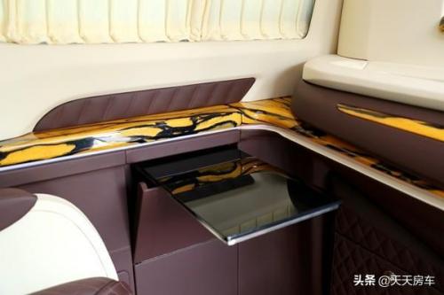 功能方面:整车控制系统的集成平板、如空调、灯光、部分使用功能一一具备触控操作;侧方电动办公桌是又一特色、奔驰商务同款的时钟、茶水i吧台、双储藏柜等再一次呼应上了。